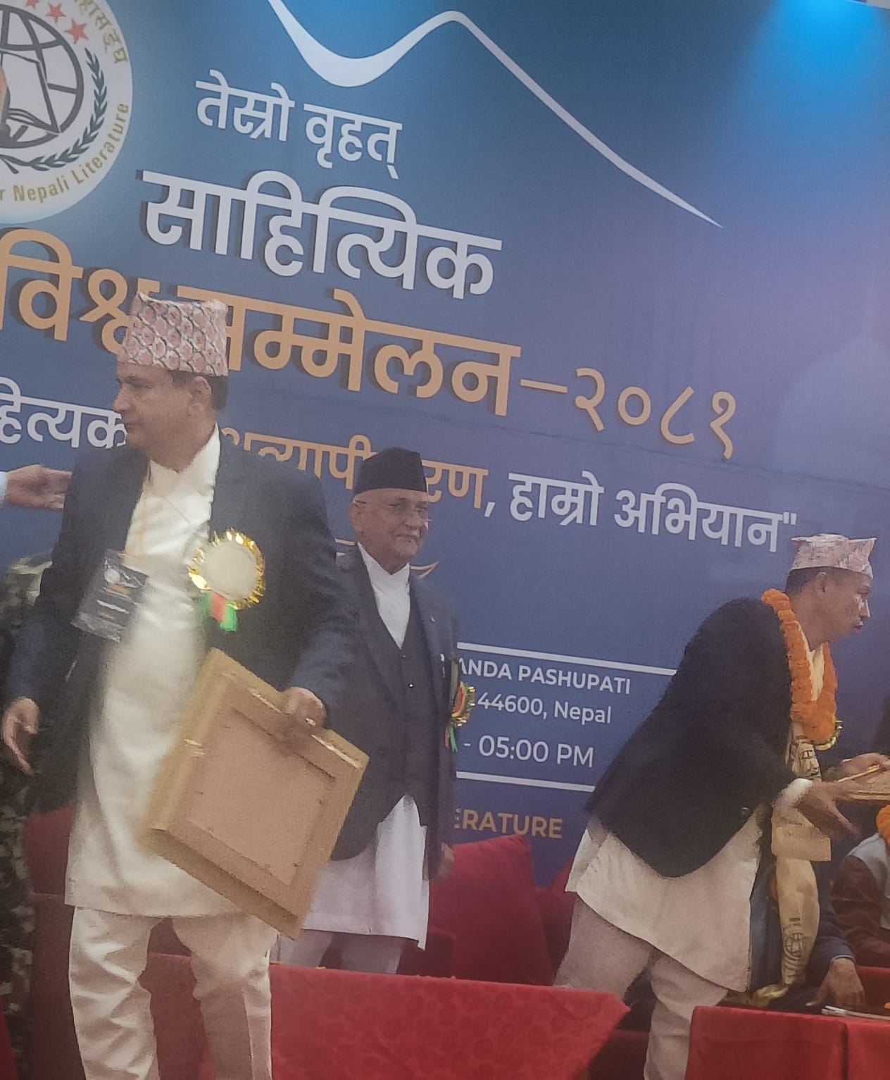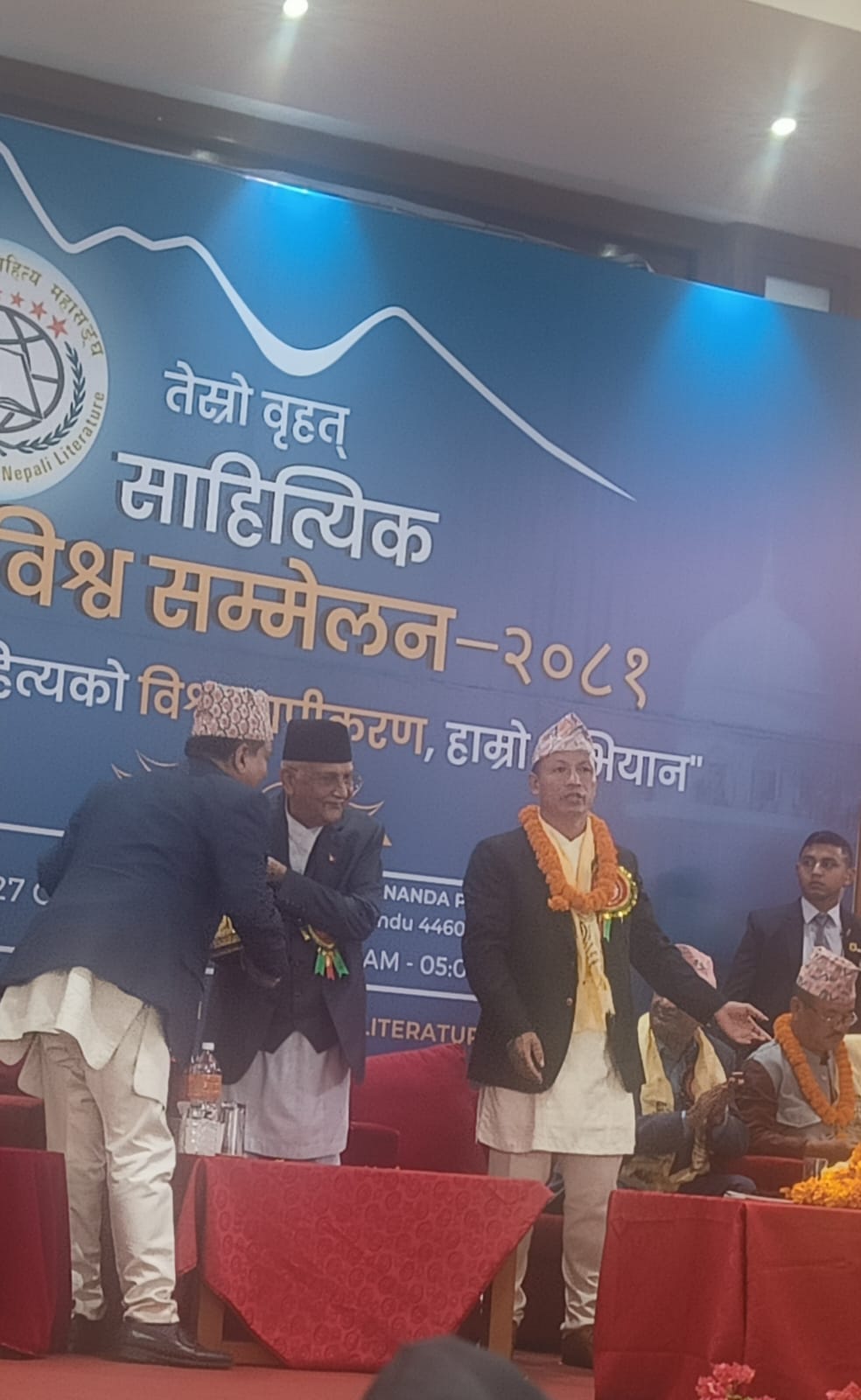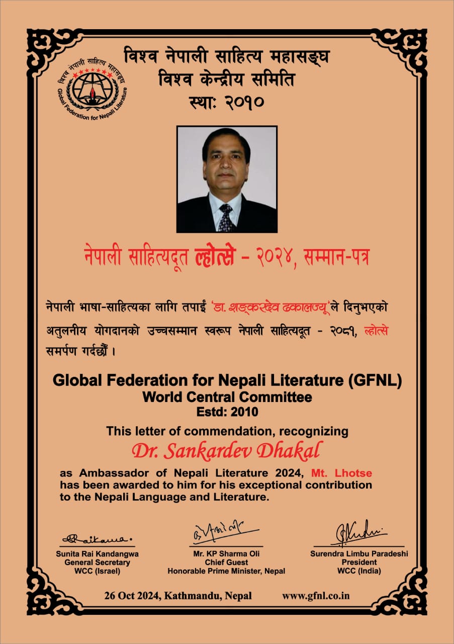 Kathmandu, October 26 : In a special event organized by the Global Nepali Literature Federation (GFNL), Dr. Shankar Deo Dhakal was honored with the title of ‘Nepali Literary Ambassador – 2081, Lhotse.’ This honor was bestowed upon Dr. Dhakal in high appreciation of his remarkable contributions to the Nepali language and literature.