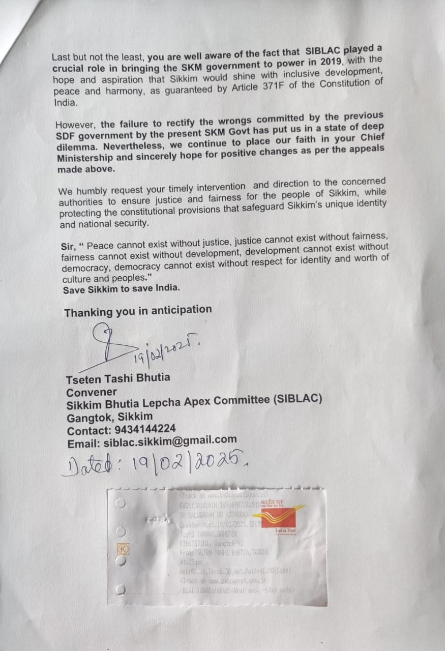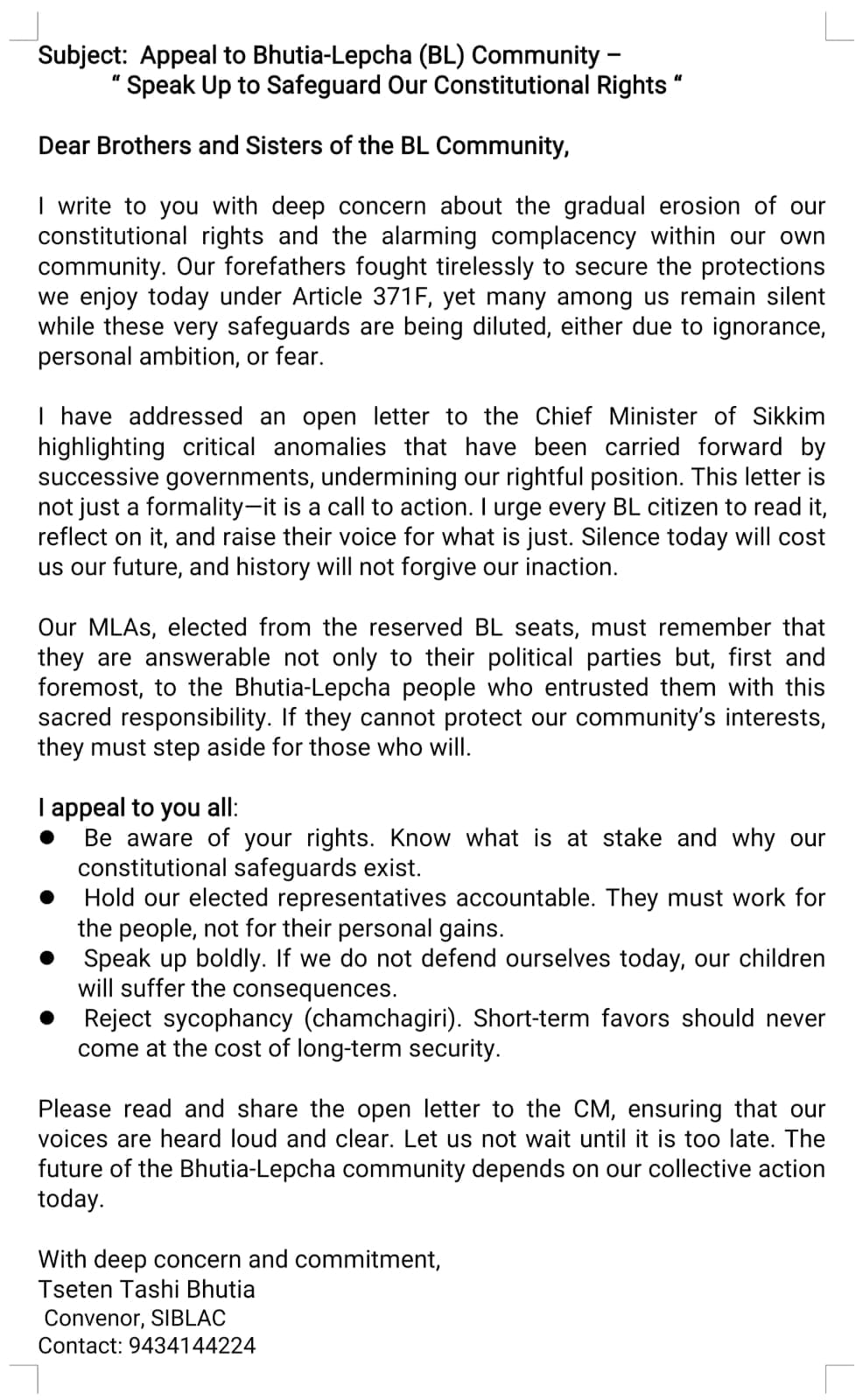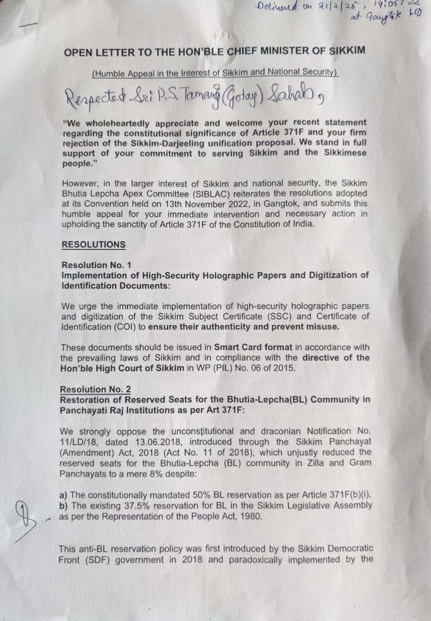 The Sikkim Bhutia Lepcha Apex Committee (SIBLAC), led by Convener Tseten Tashi Bhutia, has submitted an open letter to Chief Minister P. S. Tamang, urging immediate action to safeguard the constitutional rights of the Bhutia-Lepcha (BL) community under Article 371F.