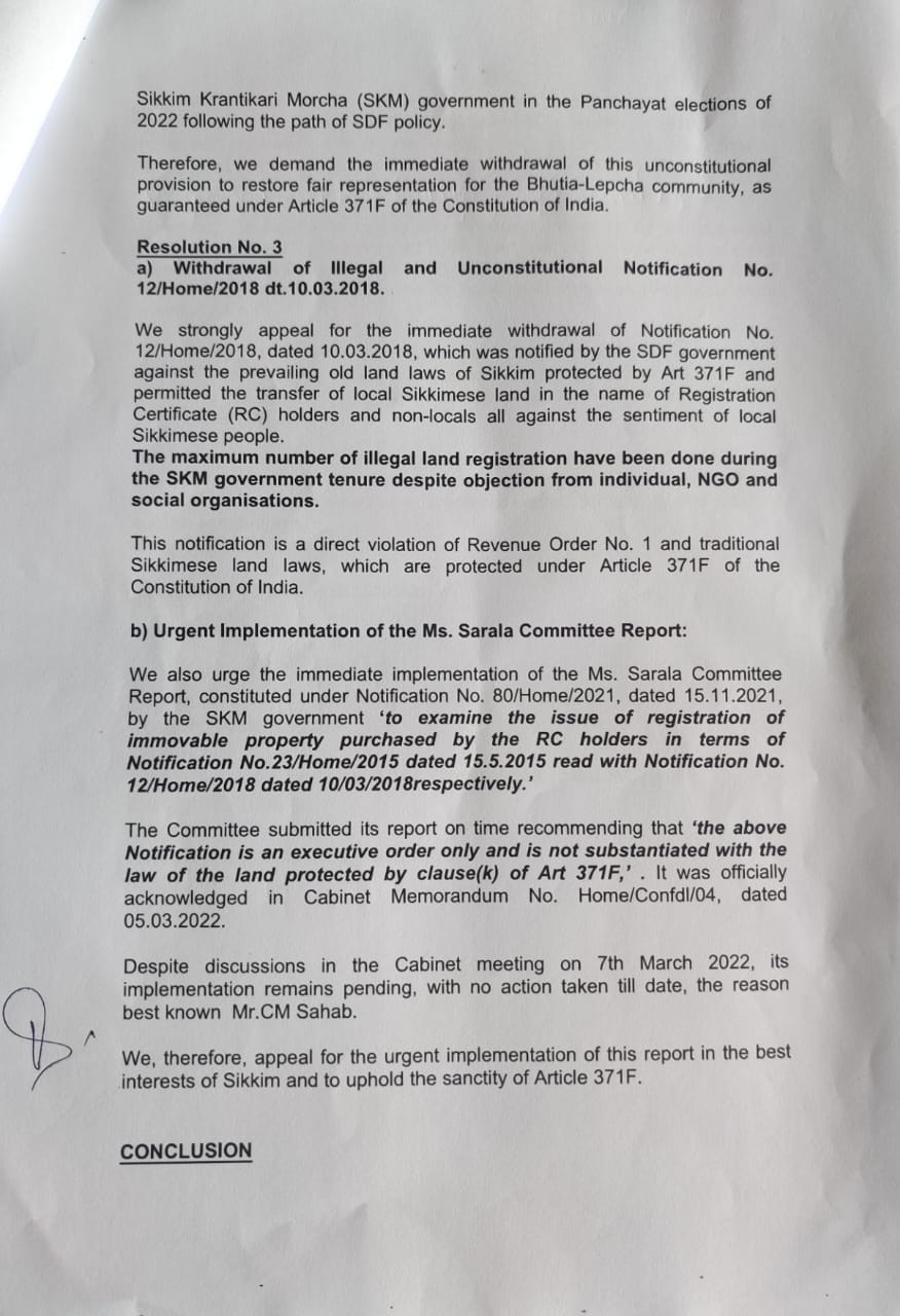The committee also seeks the withdrawal of Notification No. 12/Home/2018, which allegedly facilitated the transfer of Sikkimese land to non-locals, violating Revenue Order No. 1 and traditional land laws. SIBLAC urges the government to implement the recommendations of the Sarala Committee Report, which questioned the legality of land transfers under the notification.